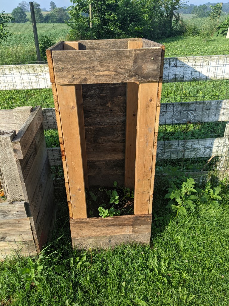 Another experiment was a potato tower that we will gradually fill with dirt and add more front slats until the plants reach the top in the fall. Then if all goes well, when it is tipped over and emptied there will be a bunch of potatoes. I was able to re-use an old feed trough left out in the field to plant some strawberries in herbs in, and although we have only gotten a few strawberries this year, I predict next year will be BERRY successful. Sorry.