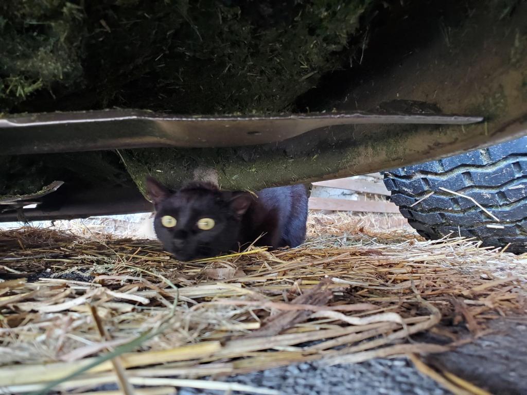 This is a post all about gardening but I need to address the barn cat apocalypse that has taken place over the last 11 months. We started out at nearly 12+/- cats wandering around the property when we moved in and now we are down to a single one. A few of the babies went on to better homes. I can only confirm two died because we buried them, and the others just walked over to the farm next door or into a car and on to the rainbow bridge in the sky. Its a damn mystery and because I got attached it leaves a little twinge of pain. I knew I was doing this to myself, but yet…. Our one remaining little black cat, Susie was the runt of her litter and up until this spring would mostly roam in between her hidey holes and would barely endure even a touch to the head. She’s now out and about and as a result of a slow exchange of pets for treats she as actually come to like us. Well, she loves Brady and kind of likes me. She wants to be right in the middle of what is going on as long as there aren’t dogs in tow, but even then she’s watching. See pic below of her trying to peep on Brady while he fixes the mower. She reminds me of Jiji in “Kiki’s Delivery Service”.