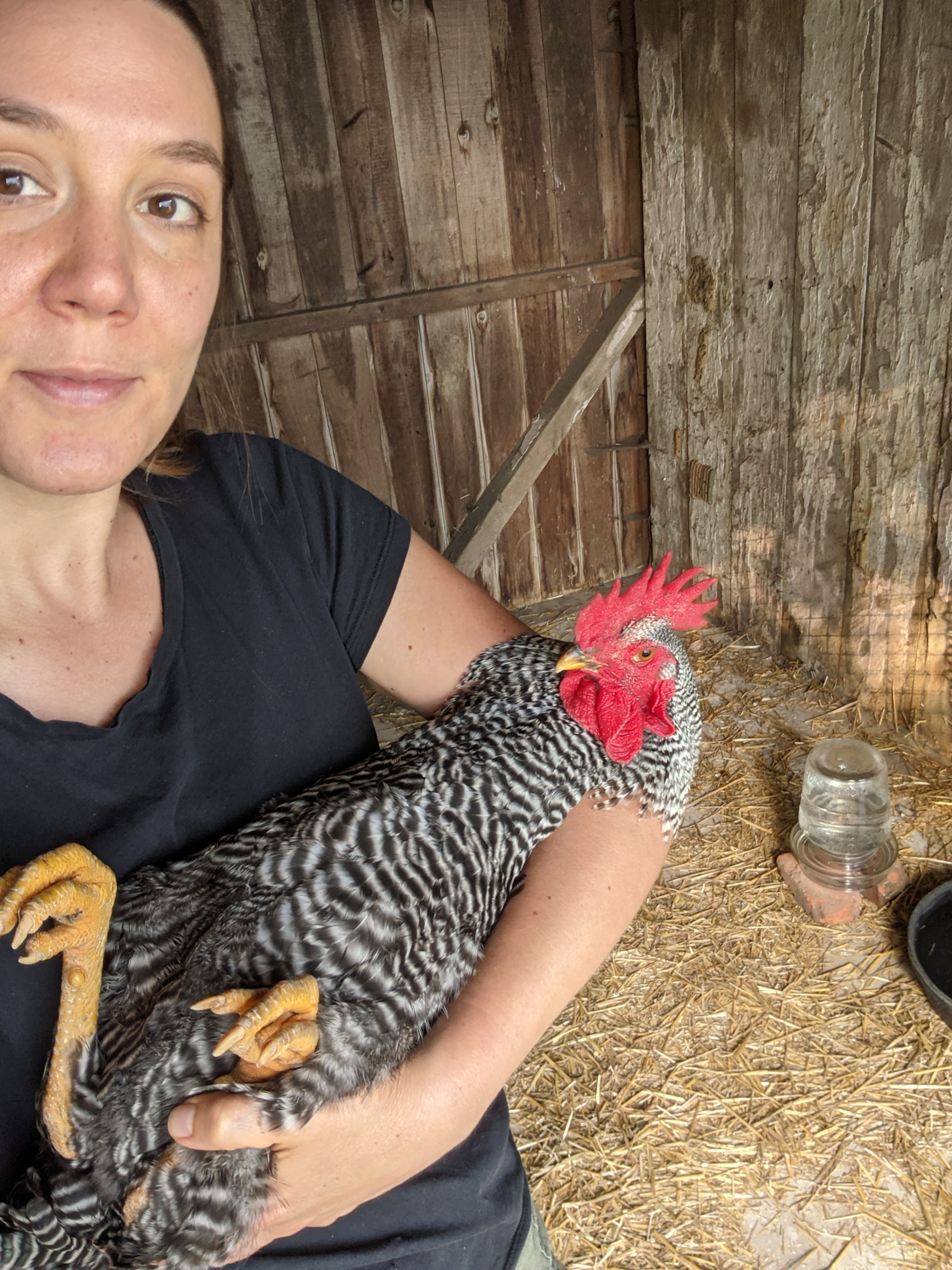 Of course, getting a rooster ends up being more complicated than just bringing him home and sticking it in with the hens. Our new guy, Monty, had to be quarantined to make sure he didn’t have any diseases unfamiliar to our chickens. A 30 day quarantine is recommended but Monty was also a surprise rooster (meaning he was meant to be a gal and his owner only wanted hens) from a pretty small, well-kept flock. I trusted the guy we got him from that he was in good health and after seeing him and his former roommates, Monty’s quarantine was cut down to about 2.5 weeks. The make-shift pen we had him in opens up right to the side of the barn, and it worked well for him but being right up against the wall of the barn really amplified his crowing. I’m sure our neighbors who normally wouldn’t really distinguish chicken sounds from the coop were happy when he finally got moved in with the rest of the hens this past weekend. Monty is pretty calm but he does have a habit of trying to come at me like he is the boss. To tamp down that instinct I have to prove to Monty, that no, I am the biggest rooster, and I dominate him. This was what we had just started to do with Freckle, but he was very fast and difficult to catch. Here is a good video exhibiting the rooster domming below. (This lady has a lot of random clips and build up so I have fast forwarded to the clip that exhibits what Monty and I do.)  Monty has bitten me a few times, but he doesnt break the skin and usually he is pretty easy to get a hold of, and likes being held. We are working to sand down the bully instincts, but so far it has not been difficult as he is pretty tame already.
