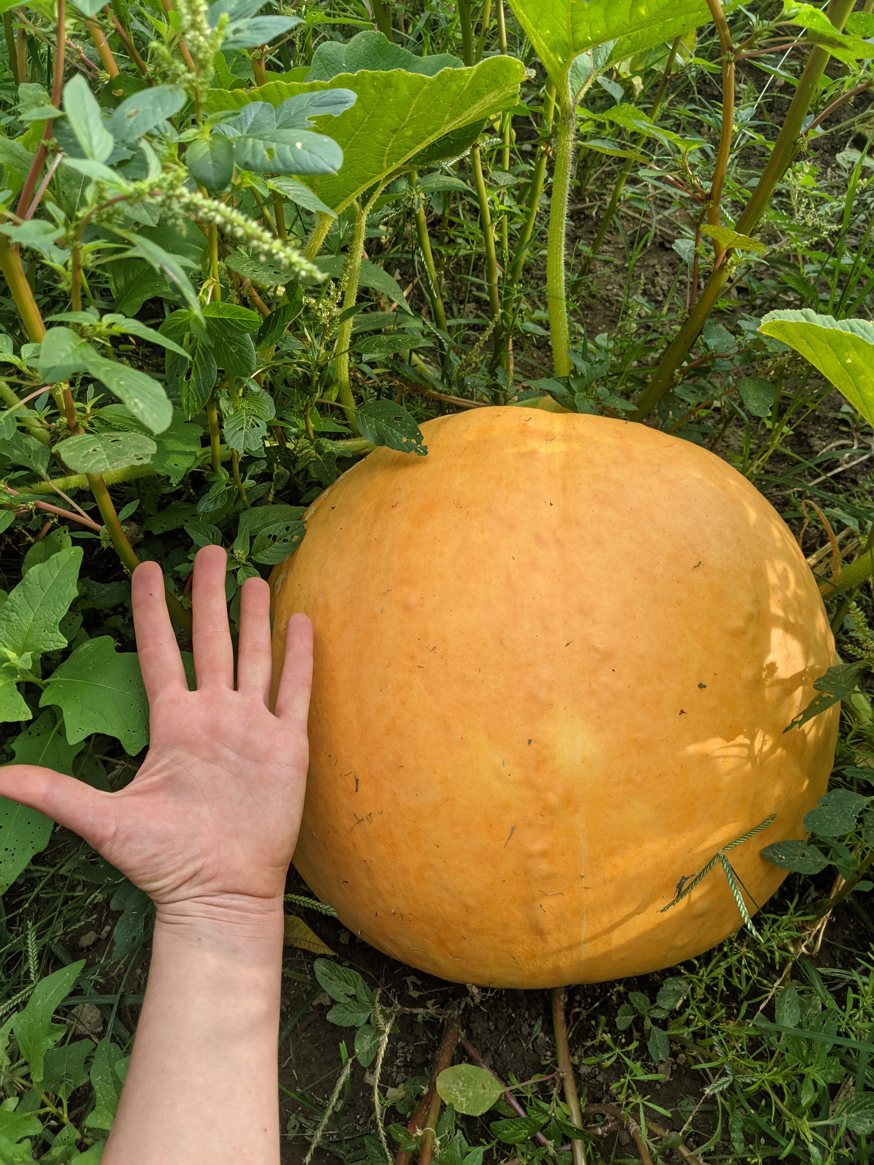 Other plants have been less of a success, watermelon vines are growing but I have yet to get a successfully ripe one off the vine whether it is from my impatience or literally from the weather knocking them off. I have only gotten 3 carrots to grow and then I maimed them in trying to harvest, and the snap peas did not take this year. Pretty soon I will re-try the snap peas and then plant some kale, broccoli, cauliflower, and attempt brussel sprouts for the fall. Also of note in the back field we tried out a pumpkin patch which has since morphed into an uncontrollable weed area. There we have a TON of butternut squash ripening, a few pie pumpkins, and one gigantic “Big Max” pumpkin that I am hoping turns into a real giant fairground prize winner behemoth.